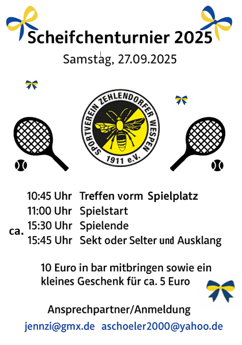 Am Samstag, dem 27. September 2025 findet von 11-ca. 15:30 Uhr endlich wieder unser Schleifchen-Turnier 2.0. statt.